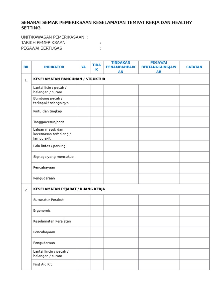 Senarai Semak Pemeriksaan Keselamatan Tempat Kerja Dan Healthy Setting Pdf
